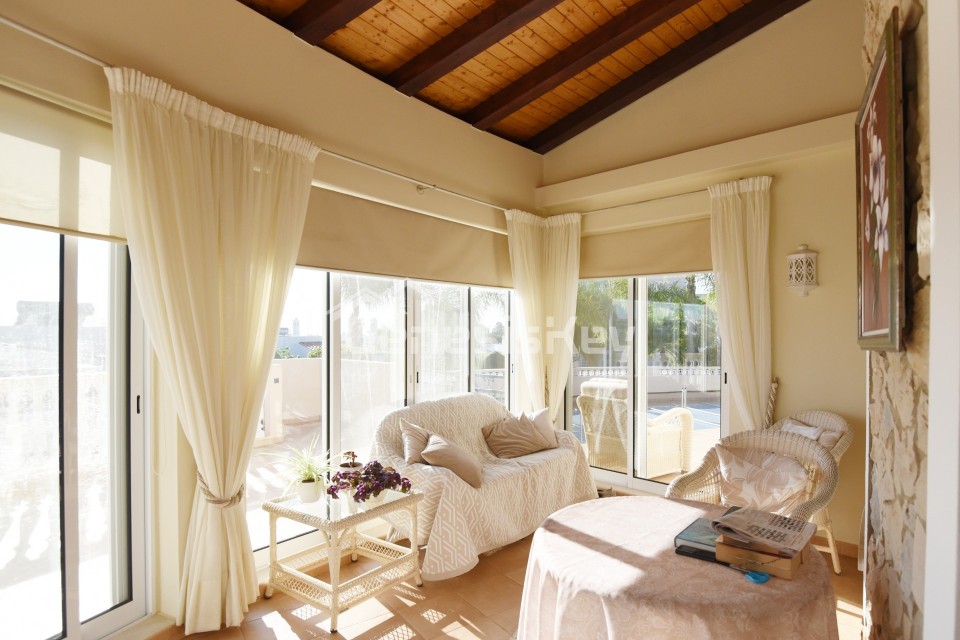 The property features two spacious bedrooms, each equipped with air conditioning, double-glazed windows, and electric shutters. The bright and generous living room with a fireplace creates a cozy atmosphere year-round. The villa also includes a private garage and a fully enclosed terrace, ideal for additional living or dining space.