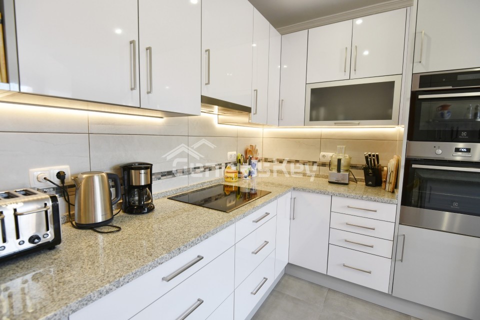 The home features a bright and spacious living and dining room with a cozy fireplace and direct access to a south-facing terrace and garden with level access—ideal for relaxing or entertaining. The fully renovated and fully equipped kitchen is modern, functional, and includes access to an outdoor drying area and additional storage space.