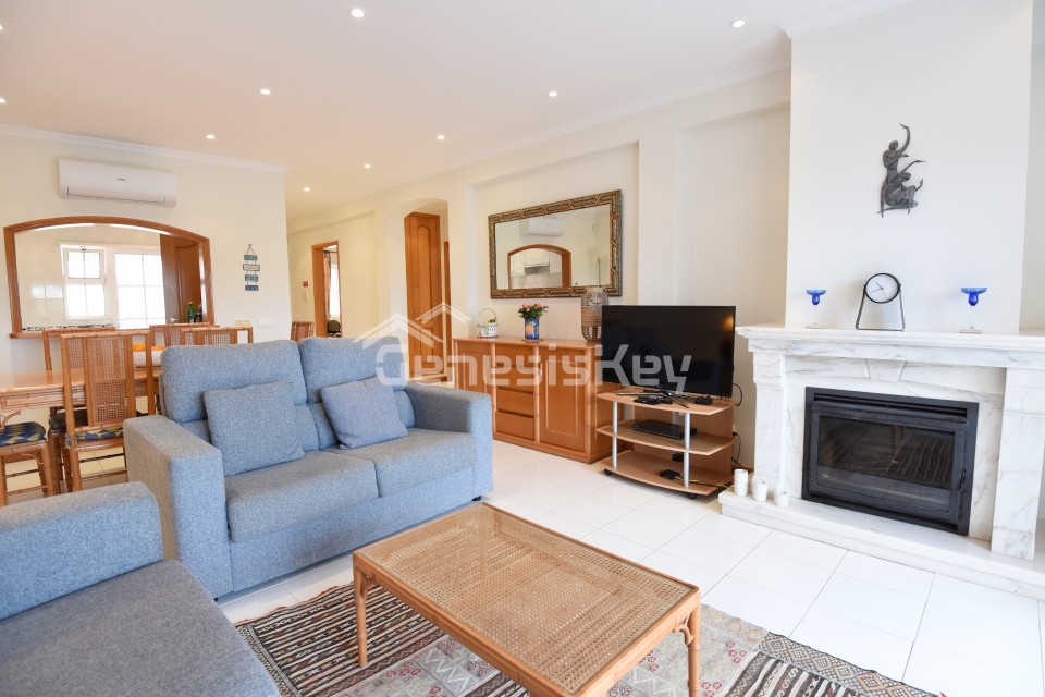 The property features a bright and elegant open-plan lounge and dining area with a charming wood-burning fireplace and double-glazed patio doors opening onto a rear terrace, perfectly positioned to enjoy the spectacular surroundings.